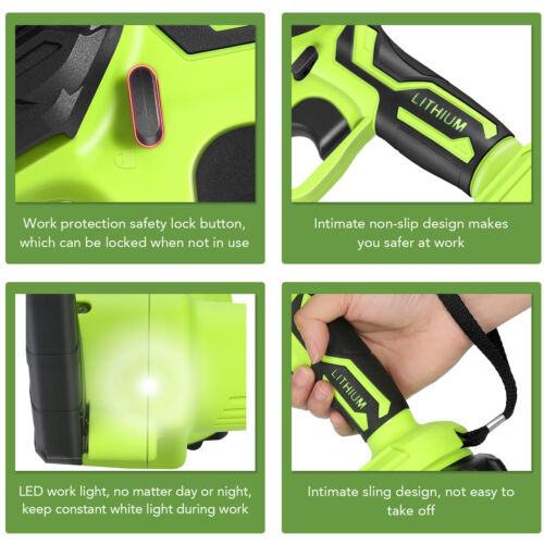 High Quality Small Tree Cutter:Rechargeable mini cordless chainsaw comes with a low kickback bar and high hardness quenched chain.The quick heat dissipation ensures the motor runs efficiently.This high-quality tree saw is tough and wear-resistant, sharp and smooth cutting, not easy to jam the chain, fast cutting, and longer service life.