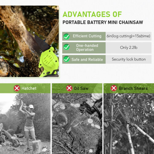 One-Handed Mini Chainsaw 6 Inch: Compared with normal 4 inch small chainsaw, this 6 inch handheld electric saw can easily cut thicker trees. The non-slip and ergonomic handle is more suitable for the palm of your hand and easy to operate.